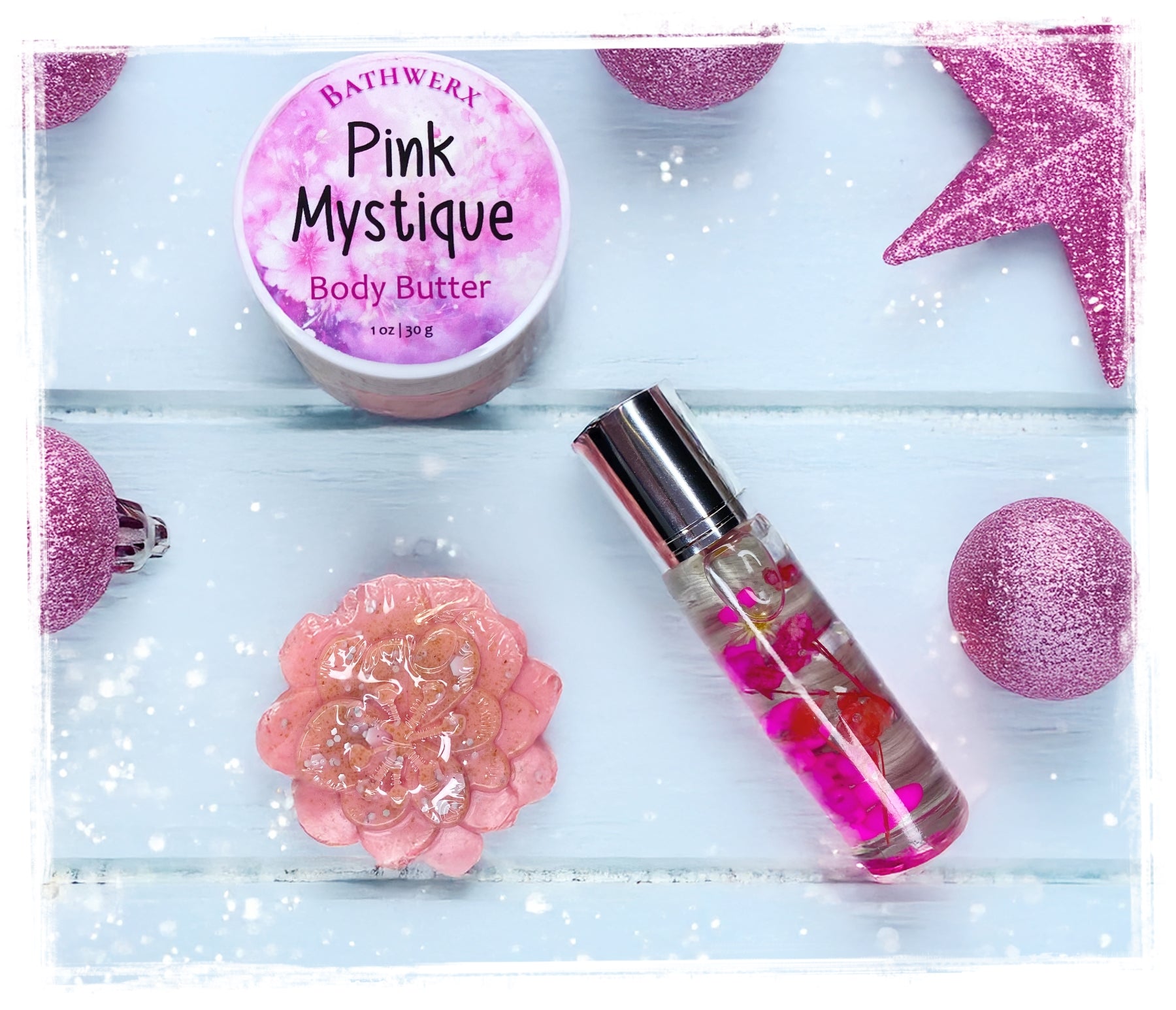 Embark on a sensory journey with our Pink Mystique Holiday Gift Set, perfect for those who crave adventure and mystery. One of our most sought-after scents, Pink Dragonfruit, Lychee, Brazilian Jasmine, Ocean Air, Hibiscus, Tonka Bean, and White Musk, now in a festive gift set. Unleash your inner wanderlust with a luxurious body butter, mini soap, and roll-on perfume included in this set.
